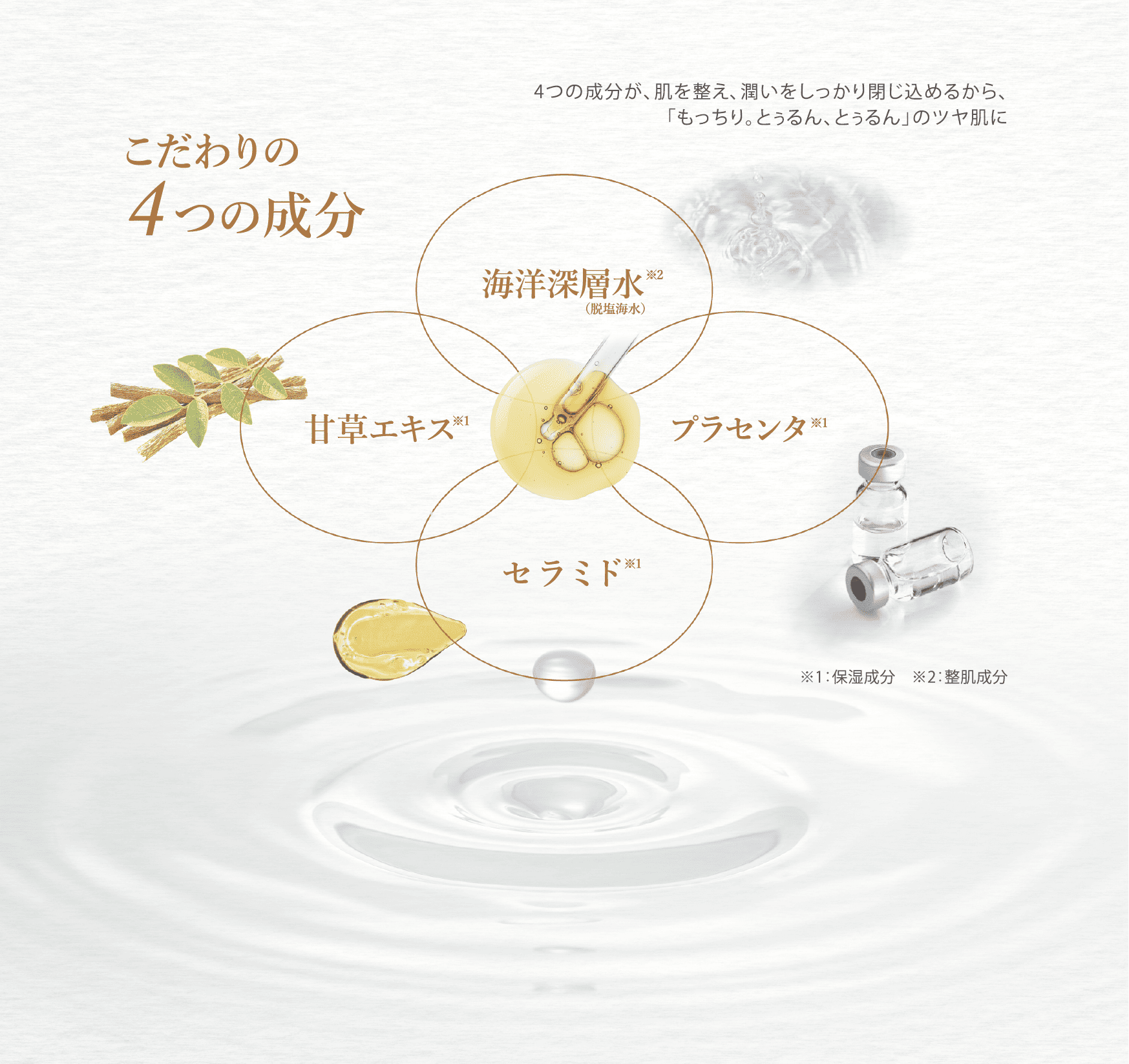 こだわりの成分が、肌を整え、潤いをしっかり閉じ込めるから、